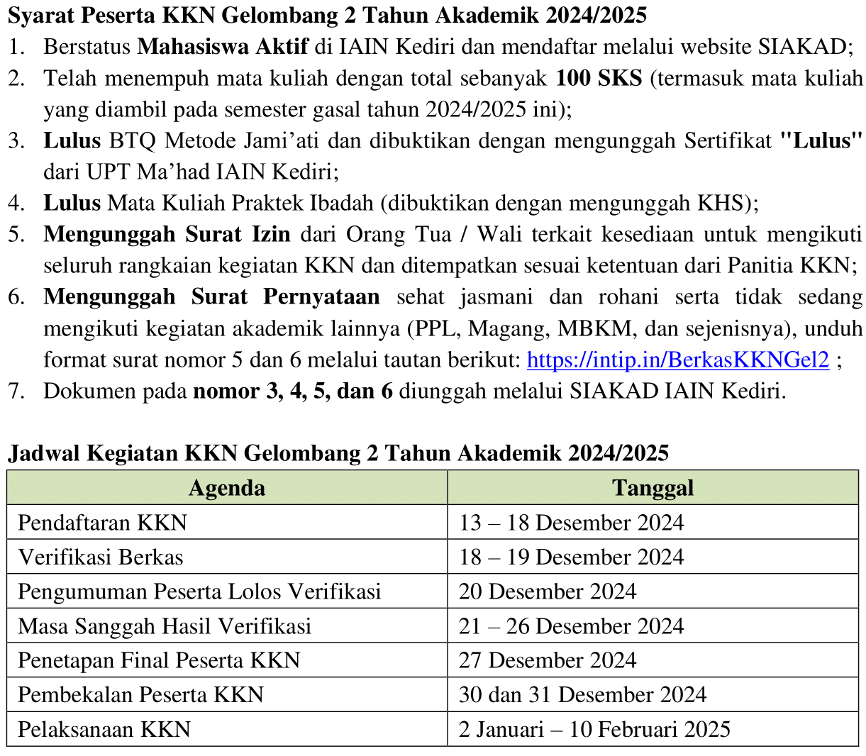 Assalamualaikum Wr. Wb.Semoga Allah SWT selalu memberikan hidayah-Nya dan melindungi kita semua. Berikut ini akan kami sampaikan surat pengumuman terkait pembukaan Pendaftaran Kuliah Kerja Nyata (KKN)